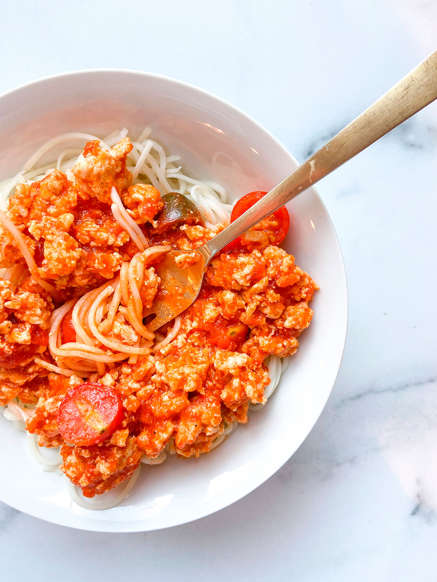 Add in the red sauce, a splash of almond milk, tomatoes & let simmer for 5 minutes to let flavors come together